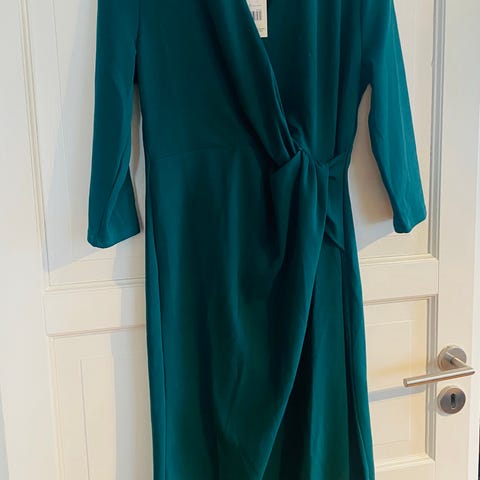 Modellen har omslagseffekt i overdelen, lange ermer og drapert detalj i siden. Lengden går omtrent til over kneet, og kjolen har et kroppsnært snitt. Passer til formelle anledninger og festbruk.