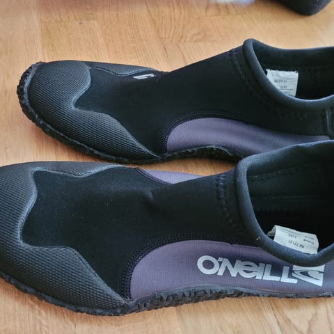 Ukjent merke badesko i svart. Skoene har perforert overdel med mange hull for drenering og lufting. Sålen er lys brun med mønster for bedre grep på våte underlag. Egner seg til bruk ved strand, basseng eller andre aktiviteter i nærheten av vann.