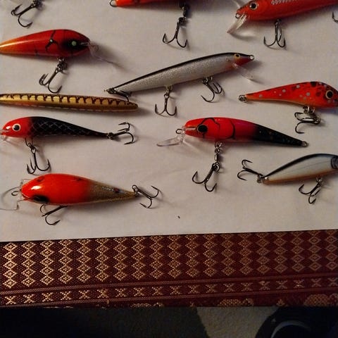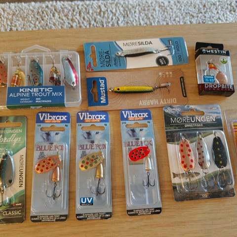 Diverse merker fiskesluker og wobblere blandet størrelser og farger