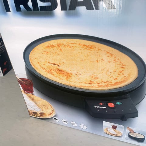 Tristar pannekake- og crepejern med utskiftbare plater i svart farge.
