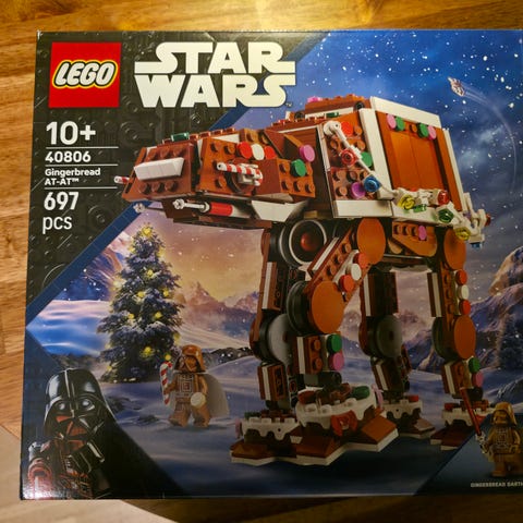 LEGO Star Wars byggesett AT-AT pepperkake 40806 med 697 deler. Settet forestiller en AT-AT inspirert av pepperkakehus, med vinter- og juletema. Passer for byggere fra 10 år og oppover. Inneholder klosser til å bygge en dekorativ modell med detaljer som godteri-elementer og snødekor. Egner seg både som byggeprosjekt og som utstillingsmodell i Star Wars- og LEGO-samlinger.