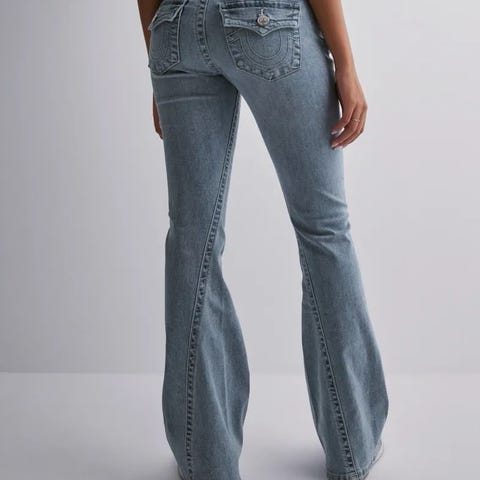 True Religion jeans for dame i blå denim. Buksen er i størrelse M med W29. Low rise. Sydd opp til lengde 30 med orginal søm😊