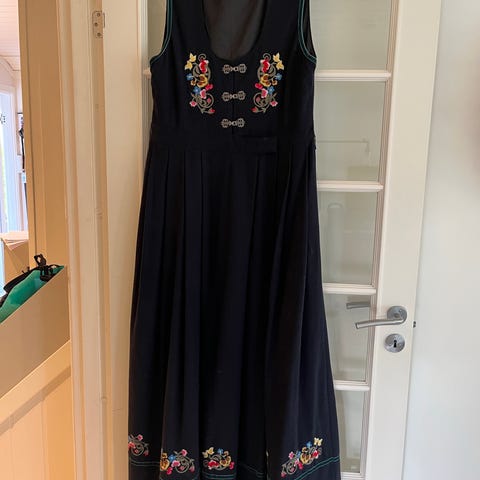 Blå Nordlandsbunad benyttet av person 165 cm høy. Er noe ekstra stoff så den kan legges litt ut, og også mulig å justere noe inn ved behov.