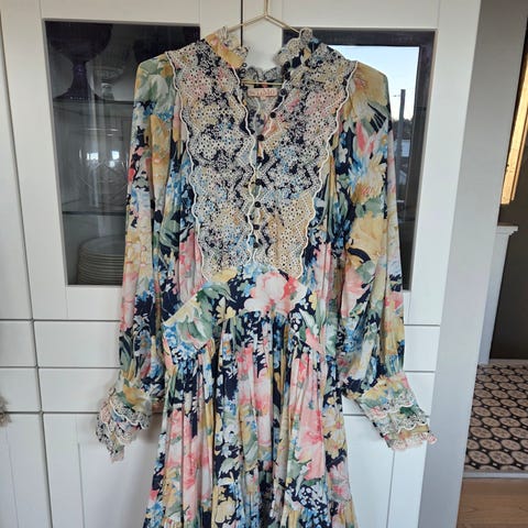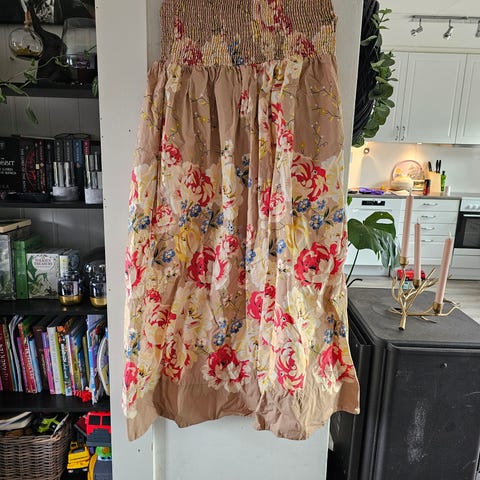 byTiMo sommerkjole i størrelse M for dame. Kjolen er laget i viskose og har et flerfarget mønster. Modellen har lange ermer, knelang lengde og voluminøs skjørtedel. Kjolen mangler en knapp helt øverst, den kom slik men har ikke hatt noe problemer med dette og dette vises heller ikke når man bruker kjolen.