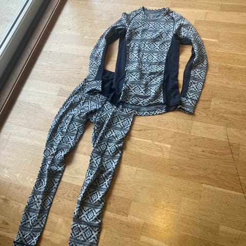 Tufte ullundertøy sett for dame i størrelse S. Sett med langermet trøye og lang bukse i fersken farge med kontrastlinning.