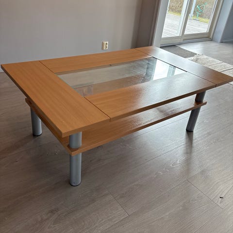 Salongbord med glassplate i midten og to skuffer. Høyde 56 cm , bredde 76 cm, lengde 136 cm.