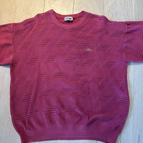 Litt retro genser mrk Lacoste str L. Fargen er varm gul og genseren har normal vidde. Kjøpt brukt og vil nå vandre videre til nye brukere.
