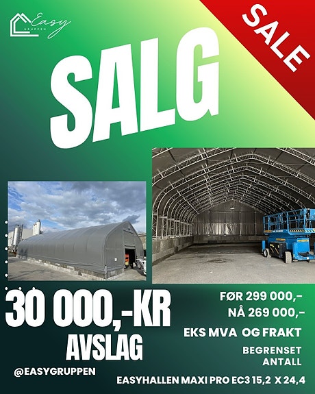 Nå gir vi 10–15 % rabatt på alle lagerførte Easyhaller i en begrenset periode! (ut mars 2026). Bestiller du en Easyhallen By Protan får du en port 4x4 inkludert i pris!