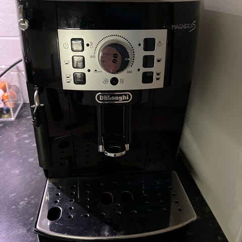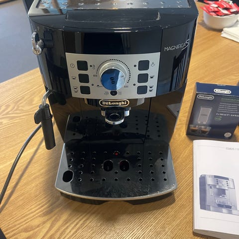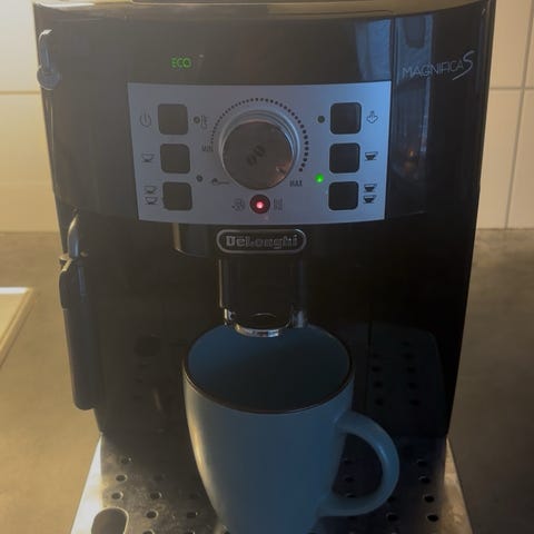 Selger en DeLonghi Magnifica S kaffemaskin i svart utførelse.
