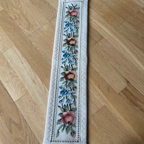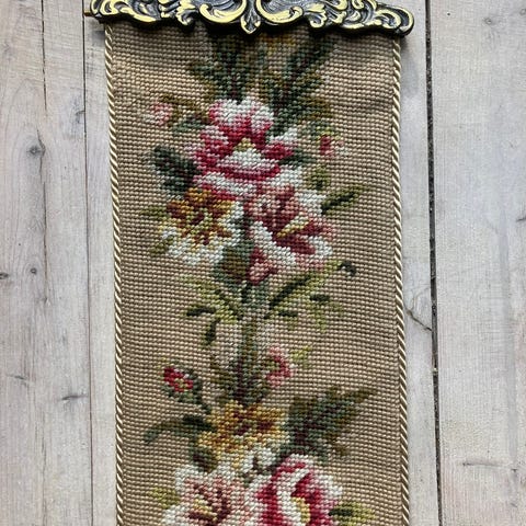 Vakker og detaljrik klokkestreng med håndbrodert motiv av rosa valmuer og grønne blader. Brodert i korssting med moulinegarn som gir motivet fine fargenyanser og et klassisk, tradisjonelt uttrykk.