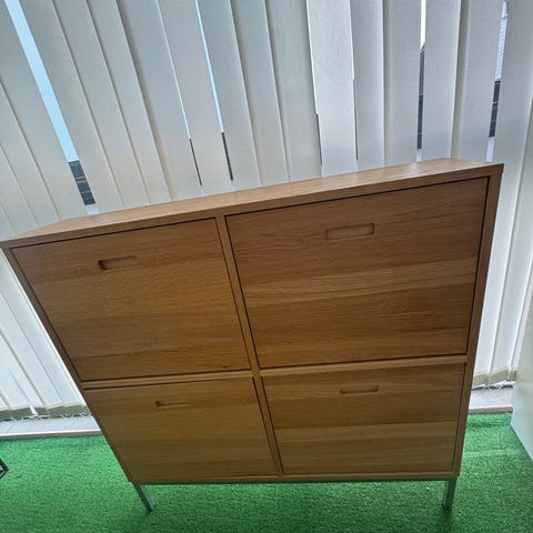 Skoskap med to skohyller som skyves ut, og en smalere kommodeskuffe oppe..