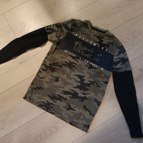 Langermet trøye med army-trykk i str. L fra Vans. Pent brukt, men litt falmet i vask som bomull ofte blir (se bilder).