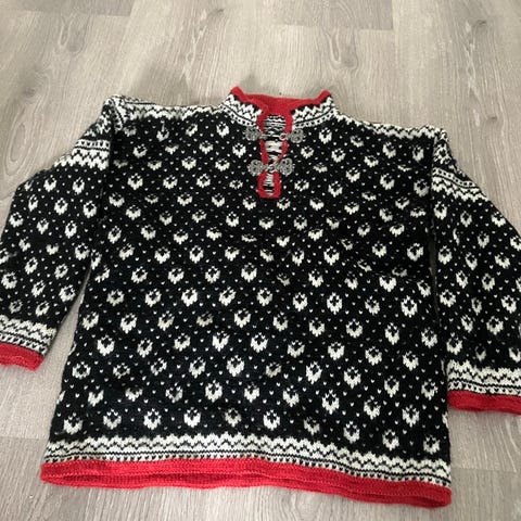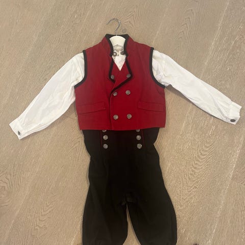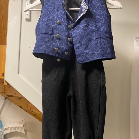 Tradisjonell barnefestdrakt til gutt fra merket Salto. Drakt med mange fine detaljer og flott bomullskjorte følger med. «Skinnlapp» bak på nikkers. Brokade vest med fine knapper.