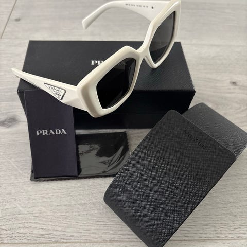 Vurderes solgt: Et par elegante Prada PR 65ZS solbriller i en klassisk og eksklusiv kombinasjon av gullfarget metallramme og havanna-stenger, med mørkegrønne glass.
