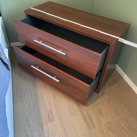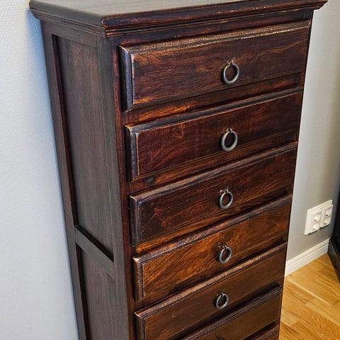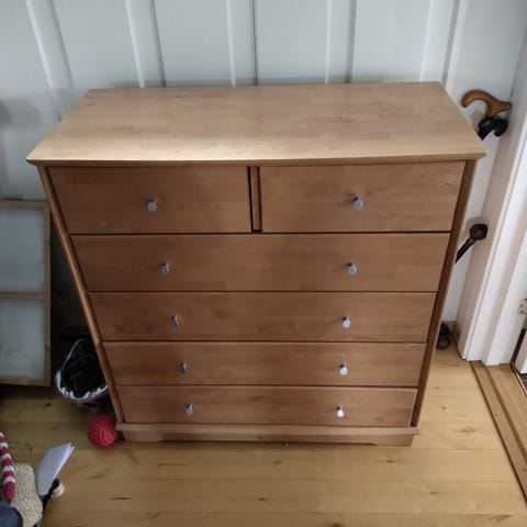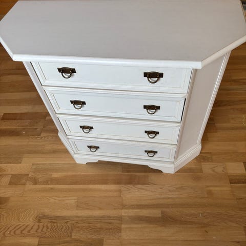 Den lille kommoden har hjul unde, antar at disse kan fjernes hvis ønskelig.