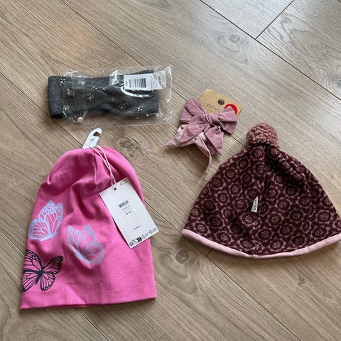 Her fÄr du et sett med fire forskjellige hodeplagg til barn i fine rosa og lilla toner. Perfekt for bÄde vÄr og hÞst, alle er i god stand og klare til bruk.