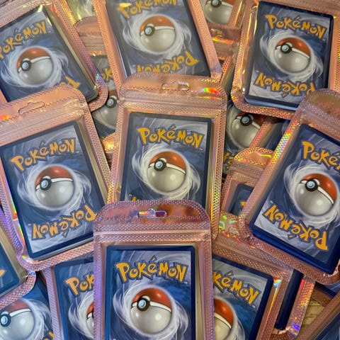 Selger ferdiglagde Pokémon-kortpakker fra Surging Sparks og Scarlet & Violet 151.