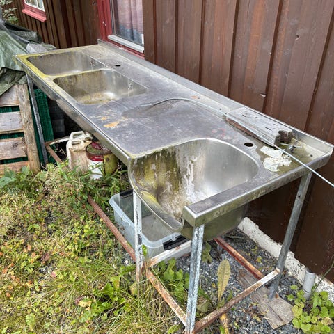Rustfri arbeidsbenk i metall med stor arbeidsflate, integrert skuff og underhylle. Benken har oppkant bak for å hindre søl mot vegg og er egnet til bruk i for eksempel storkjøkken, verksted eller andre arbeidsrom der det er behov for en robust og lettstelt arbeidsflate med oppbevaringsmuligheter. Pris: 5000,-