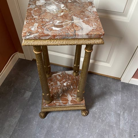 Rundt sofabord med lys marmorplate og dekorert metallunderstell i gullfarge. Bordplaten har naturlig marmorstruktur i lyse beige- og okertoner. Understellet består av slanke ben med utskårne detaljer og kryss-stag mellom bena for stabilitet.