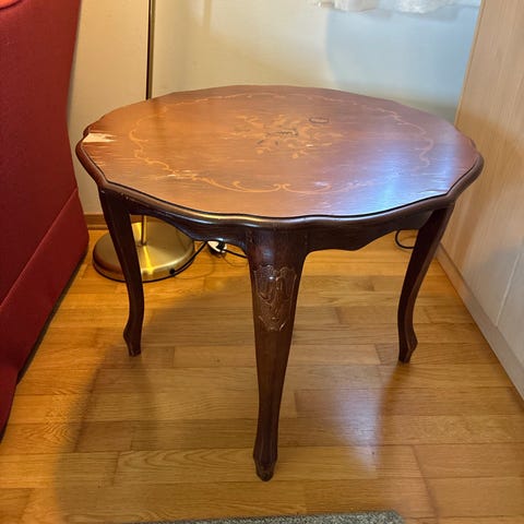 Biedermeier-stil eller generelt som et klassisk stilmøbel. Det har en karakteristisk bordplate med finert mønster i fire deler som møtes i midten, og svungne ben.
