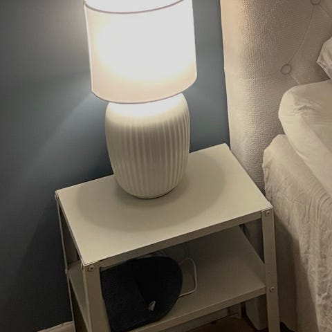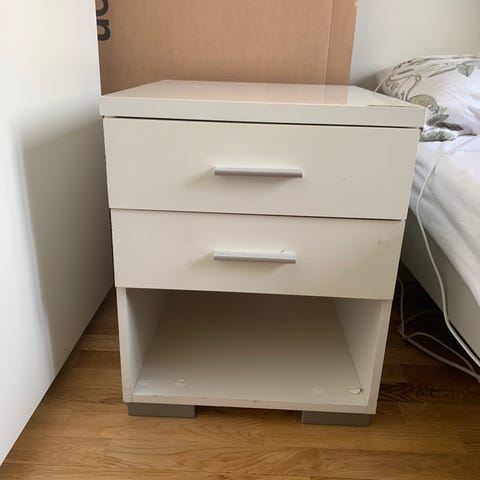 Praktisk nattbord med hjul gis bort mot henting. En av knottene under glasshyllen mangler og er erstattet med en skrue.