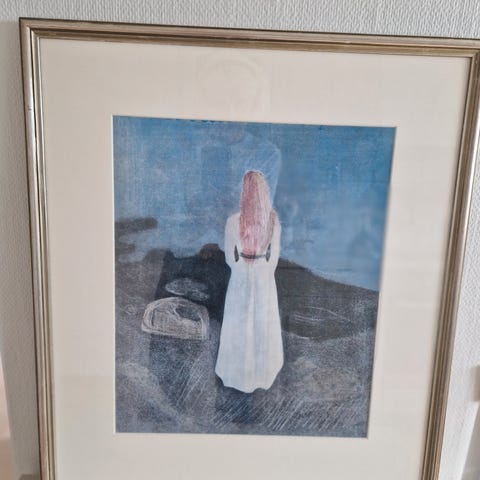 Maleri av ukjent kunstner som viser en kvinne med langt rødt hår i hvit kjole vendt mot sjøen. Bildet går i hovedsak i blåtoner med innslag av hvitt og oransje. Maleriet er innrammet i en gullfarget ramme. Egner seg som veggdekor i stue, soverom eller gang. Nærmere mål og teknikk er ikke oppgitt st 46÷58