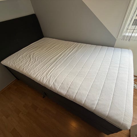 Regulerbar enkeltseng med svart underdel og hvit overmadrass. Sengen har justerbar hode- og fotende, styrt med fjernkontroll som vises på bildet. Overmadrassen er heldekkende og ligger oppå en regulerbar sengebunn. Passer som enkeltseng på soverom eller gjesterom der det er behov for elektrisk regulering av liggestilling.