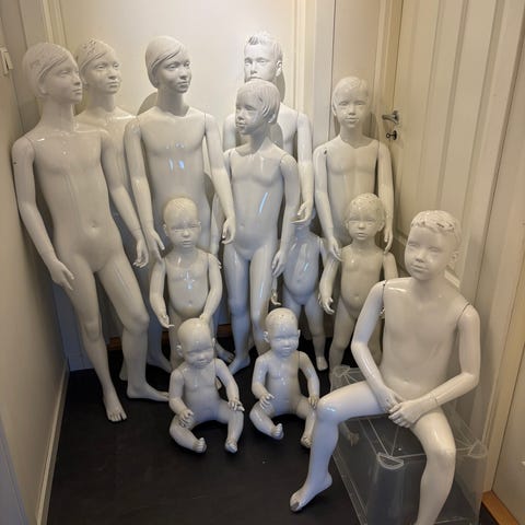 Fra SuperSellers. Barne- og babymannekenger i hvit . Flere hele figurer i ulike høyder, blant annet ca. 130 cm, 135 cm og 155 cm, samt torsoer uten hode og ben. I tillegg følger det med en sittende babymannekeng, ca. 45 cm høy i sittende stilling. Egnet for visning av barne- og babyklær i butikk, utstilling eller foto.