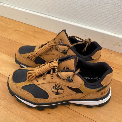 Timberland barnesko i størrelse 29 for unisex. Skoene er i brun farge med sort polstret kant rundt ankelen og snøring foran. Overdelen er i nubuck-/skinnlignende materiale med metallhemper til skolissene. Yttersålen er i gummi med grovt mønster for godt grep. Egnet som hverdagssko eller til lett turbruk for barn.