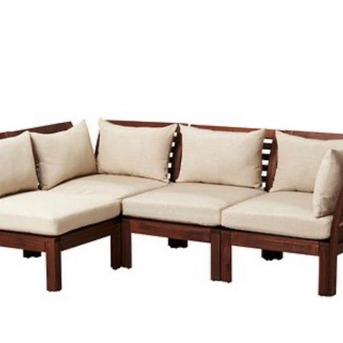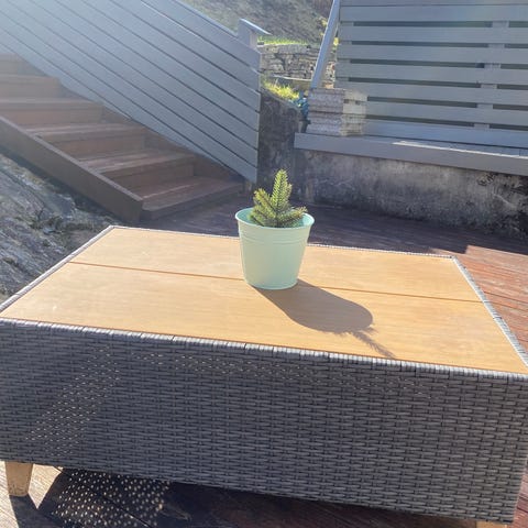 Lite kvadratisk trebord akasietre. Understellet har fire rette ben, festet med metallbeslag i hjørnene. 63x63,høyde 28.