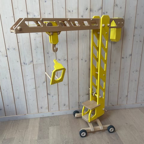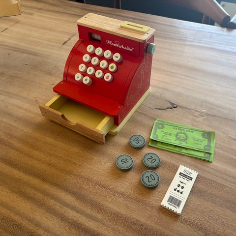 Trelekekasseapparat i rød og blå med flere funksjoner. Kasseapparatet har tastatur med trykknapper, skuff med rominndeling for lekepenger, kortleser og papirrull for kvitteringslek. Det følger med en avleser for strekkoder og lekebankkort. Passer til rollelek som butikk eller kafé for barn.
