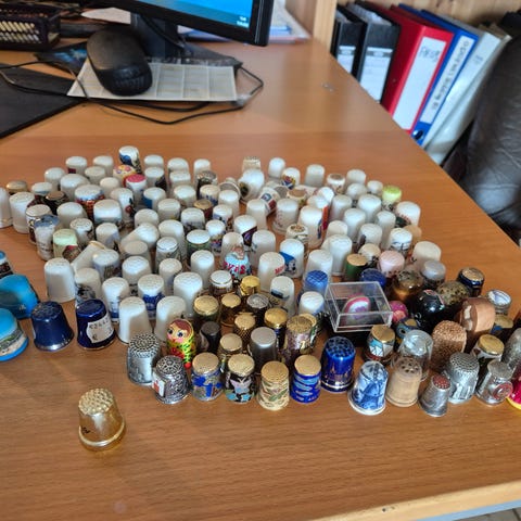 Gammel fingerbøl i sølv , med stempel . Lilla stein .