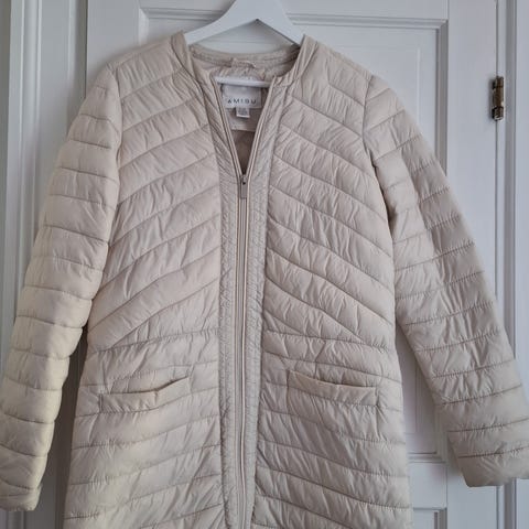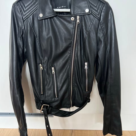 Modellen har klassisk biker-inspirert snitt med glidelås i front, glidelåslommer og belte nederst.