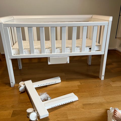 Hvit Troll bedside crib barneseng. side mot foreldresengen som kan åpnes for enkel tilgang til barnet. Den står på hjul for enkel forflytning og har justerbar høyde slik at den kan tilpasses voksenseng. Passer som babyseng ved siden av foreldreseng i de første månedene.