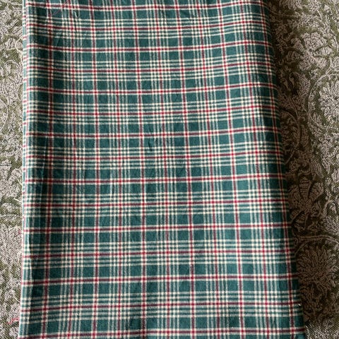 Ragnvald Grimsrud rutet stoff i acetat. Stoffet har klassisk rutemønster i rødt med innslag av grønne, hvite, gule og mørke striper. Lengde: 4,5 meter og bredde ca 150cm. Stoffet er blankt, glatt og solid kvalitet.Egnet til søm av klær, kostymer, interiørdetaljer eller andre tekstilprosjekter. (Se gjerne mine andre annonser også)