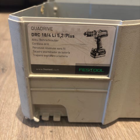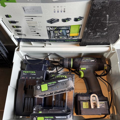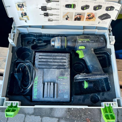 Festool batteridrill levert i plastkoffert. Settet inneholder drill, lader og 2 batterier slik det fremgår av bildet. 1 liten chuck og 2 store.