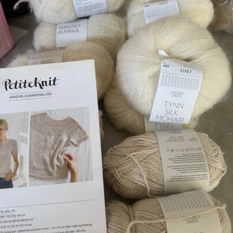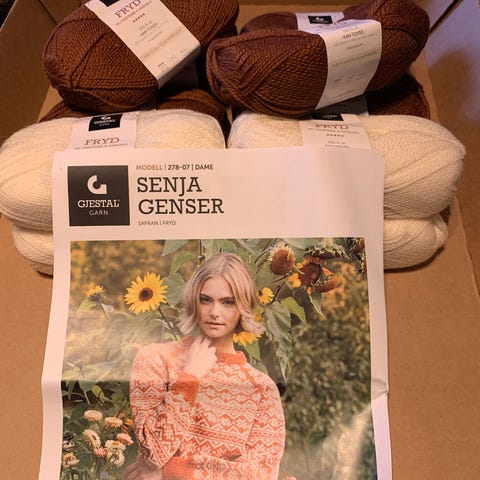 Jeg selger 6 garn med oppskrift til vest som avbildet.