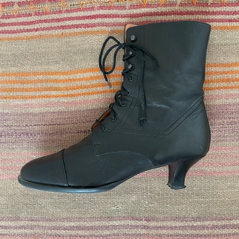 Grace Knappestøvel fra Tyrihans i størrelse 39. Modellen er en ankelhøy snørestøvlett med liten hæl. Skoene er laget i svart skinn med glatt overflate og innside i lysere skinn. Knytes med lisser foran og har hemper og maljer for snøring. Svært myke, gode og behagelige på foten. Passer kjempefint til bunader, folkedrakter og alle andre antrekk som krever denne typen sko. Skostørrelsen er normal, men knappestøvlene selges kun fordi jeg bruker en mindre størrelse.