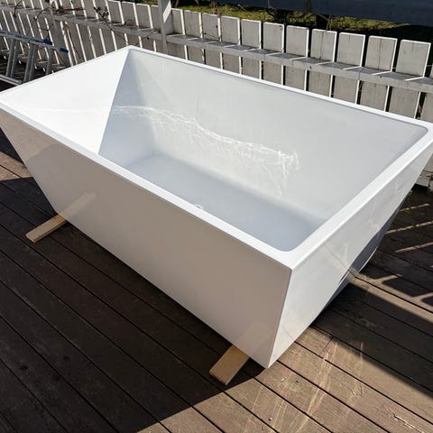 Hvitt badekar 168 cm langt og 59 cm høyt. Dét selges med blandebatteri og selges da vi vil sette inn dusj. Det ser litt gult ut på bildet, men det er skinn fra gulvet. Flott badekar.