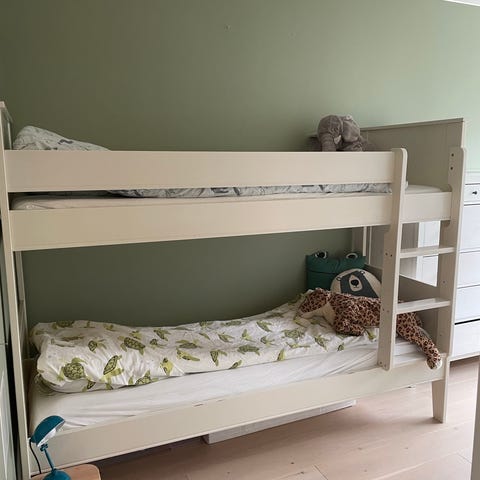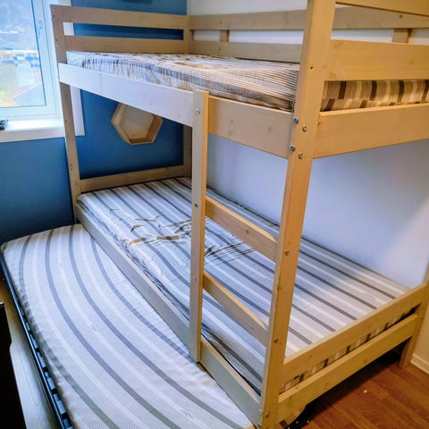 En enkel seng oppe og en dobbelseng nede i køyeseng.