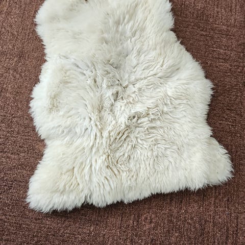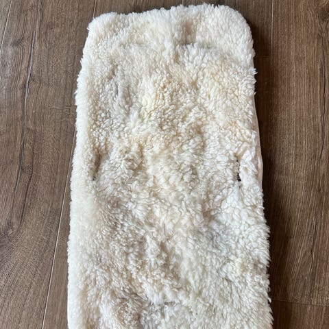 Lammeskinn til vogn. Har vært brukt som underlag under vognpose.