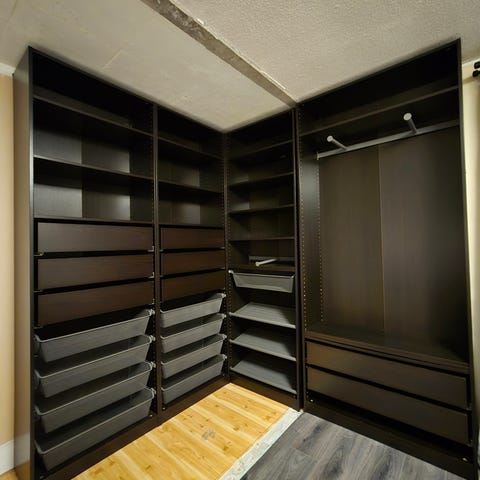 Løsningen består av åpne garderobeseksjoner med hyller, skuffer, uttrekkbare kurver og hengestang for klær. Det er flere faste hyller som egner seg til sko, esker og brettede klær, samt en seksjon med skuffer for mindre plagg og tilbehør. I tillegg er det uttrekkbare elementer som kan brukes til oppbevaring av for eksempel bukser eller annet tøy.