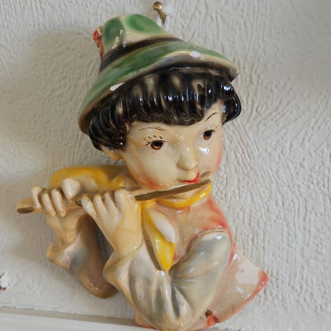 Jeg selger et artig vintage askebeger i keramikk med figur av klovn med fiolin, person med trekkspill og en hund.