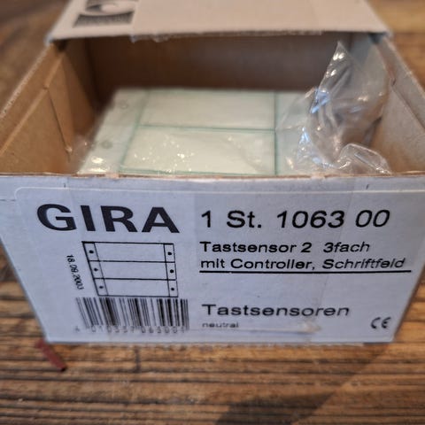 Gira 1063 00 KNX tastsensor for veggmontering i KNX-systemer. Ny, ubrukt. Modul med 3 knapper, perfekt for KNX hjemautomasjon og smart home løsninger. Kompatibel med KNX bussystem og programmeres enkelt via ETS. Passer for alle KNX-installeringer og elektronikkprosjekter.