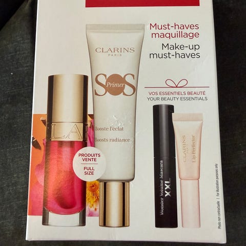 Clarins Make-up Musts gavesett med tre produkter til lepper og øyne. Settet inneholder Natural Lip Perfector 12 ml, Instant Eye Make-Up Remover 30 ml og Wonder Perfect Mascara 4D 3 ml. Lipglossen er beregnet for å gi glatte og myke lepper. Øyesminkefjerneren er formulert for å fjerne vannfast og kraftig øyesminke. Mascaraen er en sort mascara i reisestørrelse. Passer til daglig bruk og som prøvesett eller reisesett.