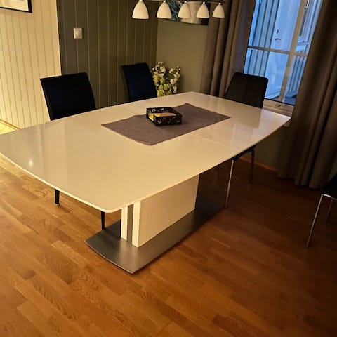 Solid bord selges uten ileggs plater. Lengde 127 bredde 88 høyde 75 cm
