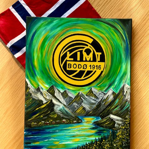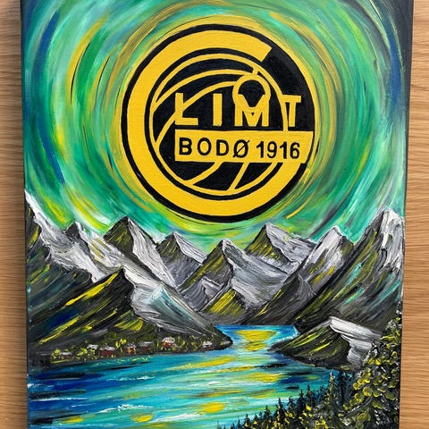 Oljemaleri av Bodø, 40X50, med F16 fly, Bodø Glimt stadion og midsommer natt. Malt i fjor og profesjonell og flott rammet inn ved Frantzen innramming hvor det er stilt ut. Inviterer til å gå se maleriet der. Kontakt meg gjerne for mer info og delbetaling mulig.