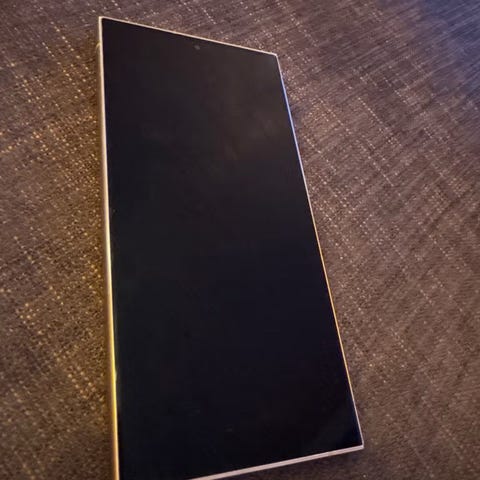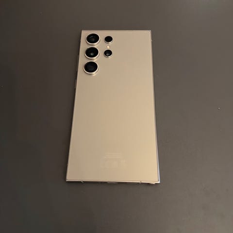Samsung Galaxy S24 Ultra mobiltelefon med 256 GB intern lagring. Stor berøringsskjerm i helfront-design og kamerahull i midten øverst på skjermen. Modellen har USB-C-tilkobling i bunnen og fysiske knapper på siden for volum og strøm. Egnet for bruk med apper, surfing, foto, video og daglig kommunikasjon. Enheten støtter lagring av bilder, video, apper og filer på den interne lagringsplassen på 256 GB.