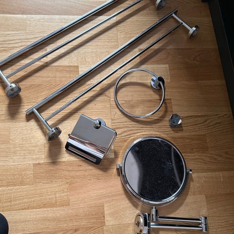 Hyllen består av flere trekantede kurver i hvit plast som monteres i et hjørne. Kurvene er festet til en teleskopstang i metall som kan klemmes fast mellom gulv og tak i dusjen eller på badet. Vann kan renne gjennom hullene i kurvene slik at flasker og såpe tørker lettere.