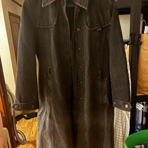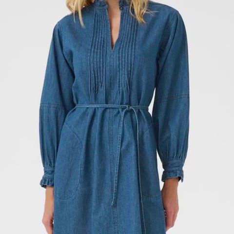 Part Two denim hverdagskjole for dame i størrelse 42. Kjolen er i svart denim-materiale og har lang lengde. Den har lange ermer, krage og glidelås foran. Praktiske brystlommer gir et enkelt og funksjonelt uttrykk. Egner seg som hverdagskjole og kan brukes både alene eller lag-på-lag etter behov.